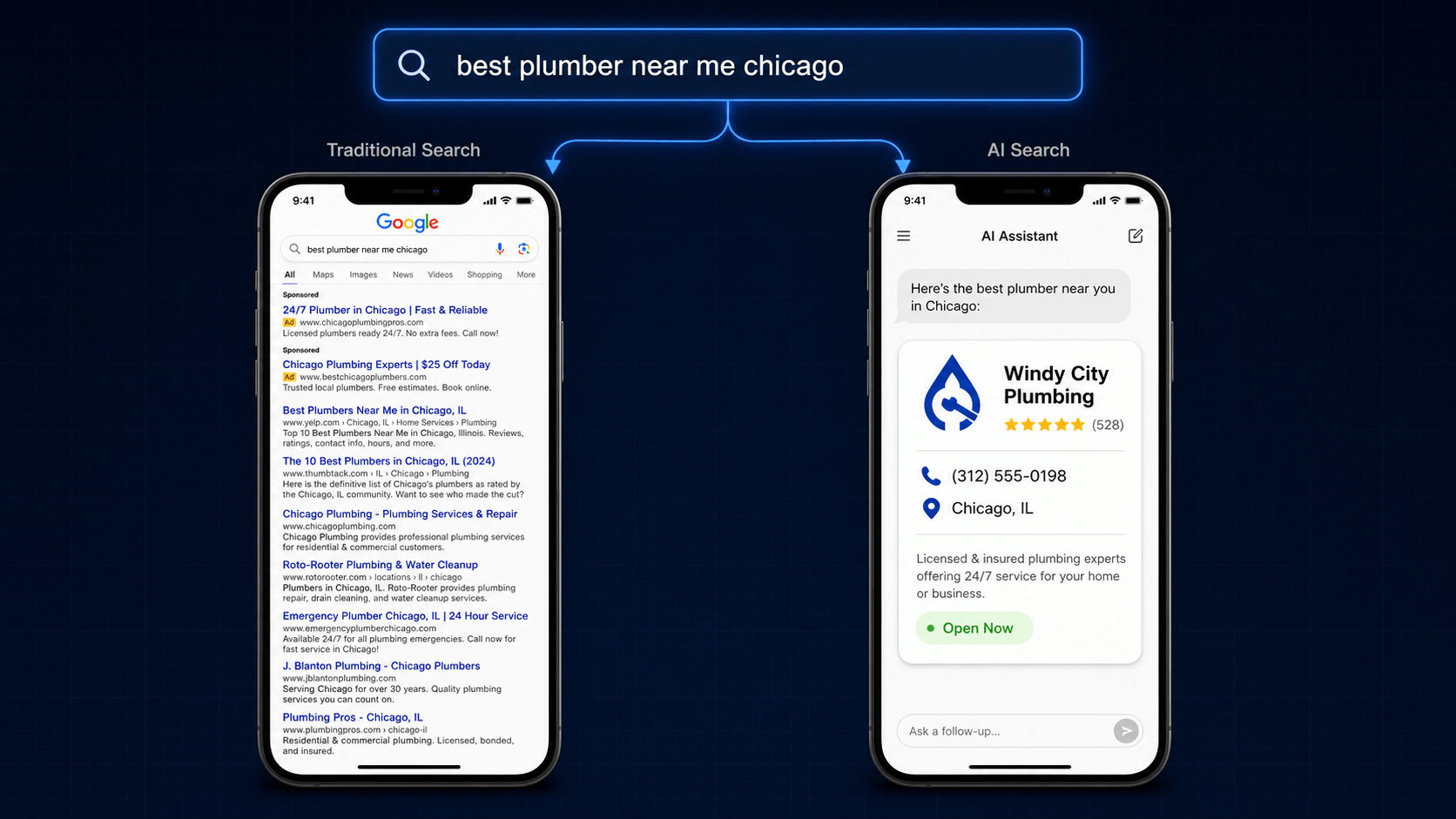 In 2026, that same homeowner opens ChatGPT and types: “Who is the most reliable emergency plumber near me right now?”